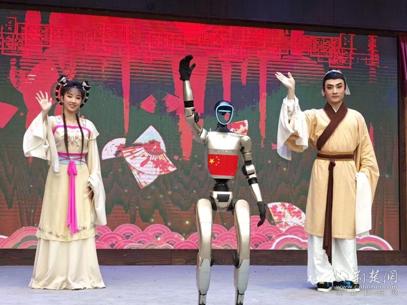 荊楚網(wǎng)(湖北日報網(wǎng))訊(通訊員王晶、費(fèi)留燦)國慶中秋假期,在黃梅縣東山問梅村,當(dāng)黃梅戲《女駙馬》的經(jīng)典唱段響起,機(jī)器人踩著婉轉(zhuǎn)唱腔靈活擺臂、轉(zhuǎn)身,復(fù)刻戲曲身段的韻味;戲腔未落,身著傳統(tǒng)獅頭裝扮的機(jī)器狗躍至臺前,跟著鼓點(diǎn)騰躍撲閃,鬃毛翻飛間盡顯靈動,引得游客紛紛舉手機(jī)拍攝,鏡頭緊追這些“特殊演員”。