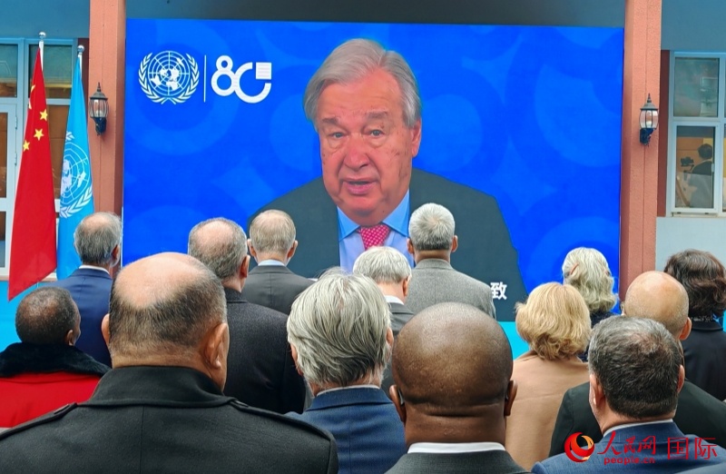 聯(lián)合國(guó)秘書(shū)長(zhǎng)古特雷斯發(fā)來(lái)聯(lián)合國(guó)日致辭視頻。人民網(wǎng)記者 李琰攝