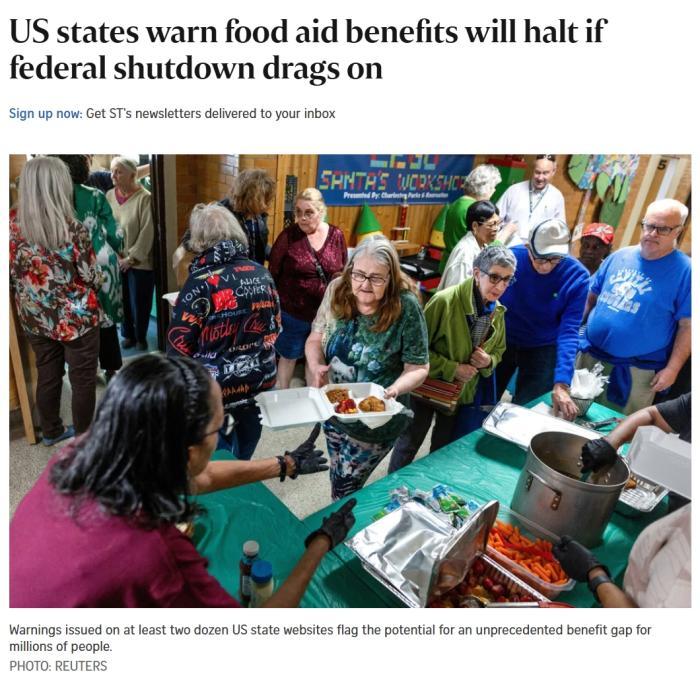 據(jù)美國(guó)廣播公司(ABC)報(bào)道稱,美國(guó)農(nóng)業(yè)部在一份通知中表示: “歸根結(jié)底,資金已經(jīng)枯竭。11月1日起將不會(huì)發(fā)放任何福利?!?/p>