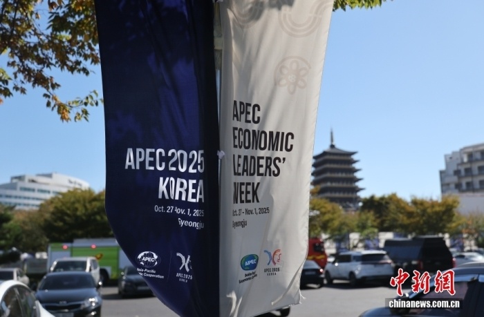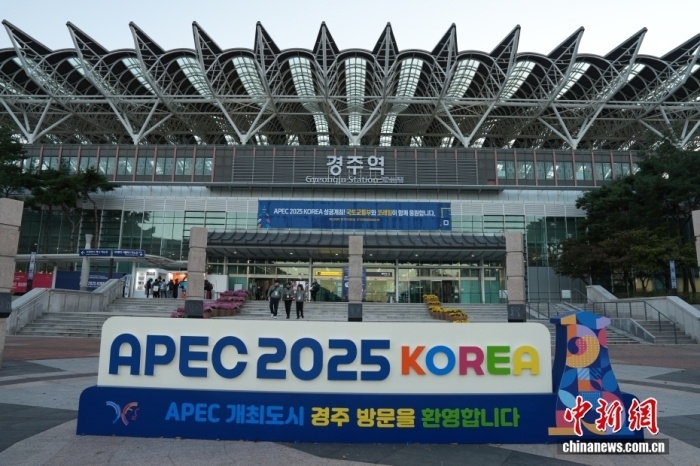 當?shù)貢r間10月27日,韓國慶州火車站前的亞太經(jīng)合組織(APEC)標識。中新社記者 劉旭 攝