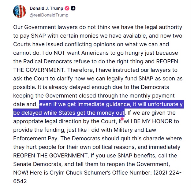 按照特朗普的最新表態(tài),“即便得到了明確的法律指引,各州的資金發(fā)放仍然會被推遲”。有美國媒體分析認(rèn)為,盡管法官作出了恢復(fù)“補(bǔ)充營養(yǎng)援助計(jì)劃”的裁決,但資金從撥付到具體落地,仍然需要經(jīng)歷一系列法律與行政流程,因此4200萬美國人的基本食物供應(yīng)難題可能會從11月開始持續(xù)一段時(shí)間。