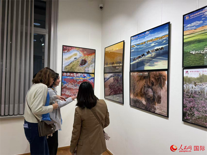 布魯塞爾的秋日午后,馬頭琴曲《天邊》的悠揚(yáng)旋律在文化中心大廳回蕩,與展廳內(nèi)的影像畫面交相輝映。渾厚悠長的《蒼天般的阿拉善》樂聲,映襯著巴丹吉林沙漠的全景圖片,令人仿佛置身大漠深處。提前到場的嘉賓們饒有興致地翻閱文旅手冊與遺產(chǎn)保護(hù)資料,對這片來自中國北疆的神奇土地充滿好奇與期待。