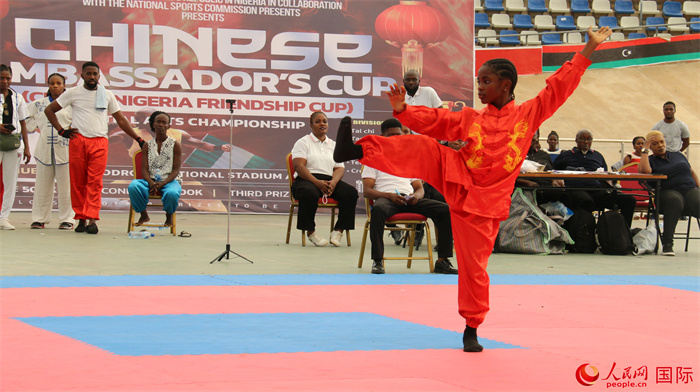 決賽活動(dòng)現(xiàn)場(chǎng),來自尼日利亞各地的武術(shù)愛好者圍繞太極、套路、男子散打、女子散打、創(chuàng)意表演、團(tuán)體比賽等六個(gè)比賽項(xiàng)目展開激烈角逐。場(chǎng)上,選手們一招一式,有板有眼,充分展示了中國(guó)武術(shù)文化蘊(yùn)含的堅(jiān)韌、拼搏精神,贏得了觀眾陣陣掌聲與歡呼聲。