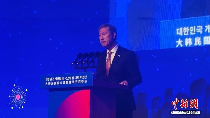 11月6日,韓國駐華大使盧載憲在招待會上致辭?!≈行戮W(wǎng)記者 蘇婧欣 攝