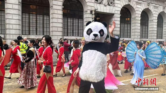 隊(duì)伍最前列由六位身著旗袍的禮儀女士領(lǐng)銜、她們或手持中國書畫卷軸、或佩戴印有“好美諸暨”“英國浙江會(huì)”字樣的綬帶與珍珠飾品。她們身后登場的,是充滿童趣與文化象征意義的第二方陣——兩只憨態(tài)可掬的大熊貓、兩顆孕育珍珠的貝殼,以及三朵亭亭玉立的荷花。