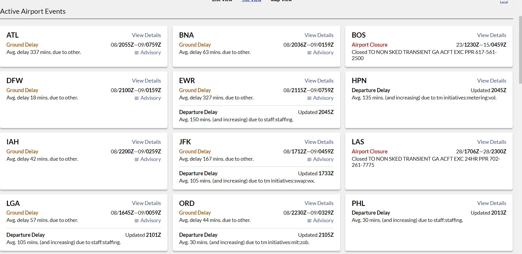 △航班追蹤網(wǎng)站截圖,美國(guó)部分出現(xiàn)延誤情況的機(jī)場(chǎng)