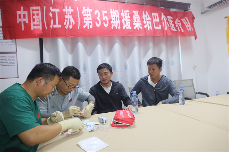 醫(yī)療隊(duì)員給華僑做檢查。中國(guó)援桑醫(yī)療隊(duì)供圖