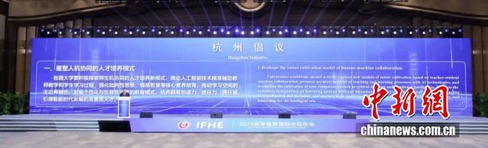 11月9日杭州2025高等教育國際論壇開幕式上,中國高等教育學會副會長、中國工程院院士周玉宣讀《杭州倡議》。(主辦方供圖)