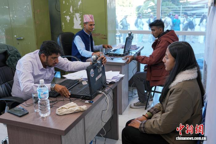 當(dāng)?shù)貢r(shí)間11月11日,尼泊爾加德滿都,工作人員在加德滿都地區(qū)選舉辦公室為年輕人注冊(cè)選民信息。中新社記者 崔楠 攝