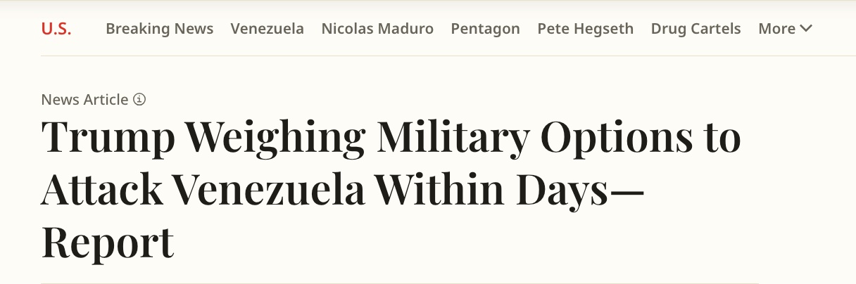 △美國(guó)《新聞周刊》報(bào)道,特朗普正在權(quán)衡于數(shù)日內(nèi)對(duì)委內(nèi)瑞拉發(fā)起軍事打擊。