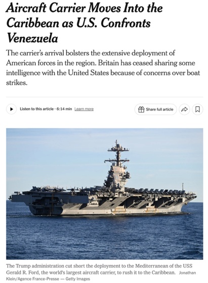 △《紐約時(shí)報(bào)》報(bào)道,美國(guó)最先進(jìn)的“福特”號(hào)航母日前進(jìn)入加勒比海區(qū)域,美國(guó)政府正在考慮采取進(jìn)一步軍事行動(dòng),旨在推翻馬杜羅政權(quán)。