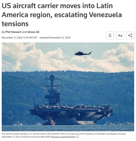 △路透社報(bào)道,針對(duì)“福特”號(hào)航母駛近委內(nèi)瑞拉近海,馬杜羅否認(rèn)自己與毒品有關(guān),稱(chēng)美國(guó)此舉旨在推翻其政權(quán)。