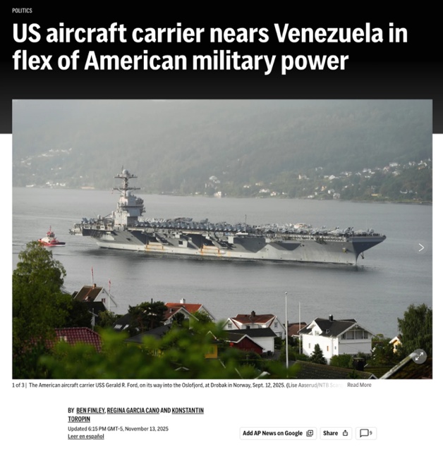 △美聯(lián)社報(bào)道,“福特”號(hào)航母將在數(shù)日內(nèi)抵達(dá)委內(nèi)瑞拉近海,美國(guó)的這種軍事力量展示,在拉美已有數(shù)代人未曾見(jiàn)過(guò)。