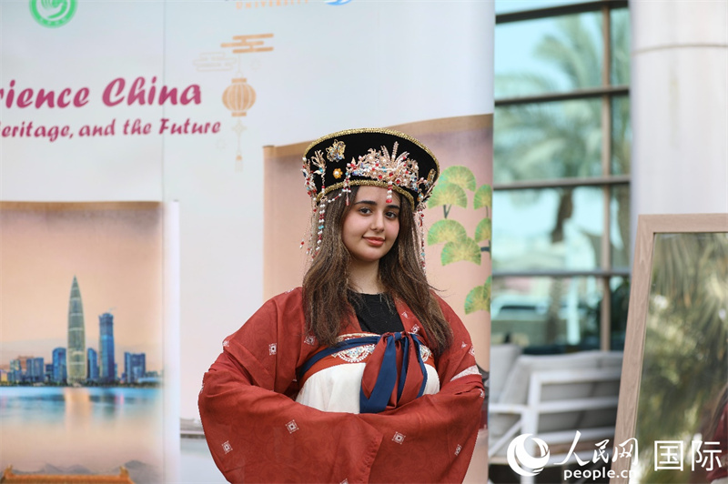 沙特學生體驗穿漢服。人民網(wǎng)記者 任皓宇攝