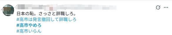 在社交媒體平臺上,出現(xiàn)了“高市辭職”“高市住手”“請高市撤回發(fā)言”等多個標簽。日本網(wǎng)民紛紛表示,高市的錯誤言論給日中關(guān)系埋下隱患,希望她盡快道歉。