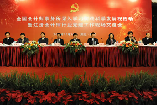 11月26日,財(cái)政部會計(jì)師事務(wù)所深入學(xué)習(xí)實(shí)踐科學(xué)發(fā)展觀活動指導(dǎo)小組、中國注冊會計(jì)師行業(yè)黨委在湖北省武漢市召開全國會計(jì)師事務(wù)所深入學(xué)習(xí)實(shí)踐科學(xué)發(fā)展觀活動暨注冊會計(jì)師行業(yè)黨建工作現(xiàn)場交流會,深入學(xué)習(xí)貫徹黨的十七屆四中全會精神,總結(jié)各省市區(qū)會計(jì)師事務(wù)所學(xué)習(xí)實(shí)踐活動和行業(yè)黨建工作做法,交流經(jīng)驗(yàn),探討方法,凝聚共識,更加扎實(shí)有效地推進(jìn)會計(jì)師事務(wù)所學(xué)習(xí)實(shí)踐活動和行業(yè)黨建工作。財(cái)政部黨組成員、副部長、財(cái)政部會計(jì)師事務(wù)所深入學(xué)習(xí)實(shí)踐科學(xué)發(fā)展觀活動指導(dǎo)小組副組長、中國注冊會計(jì)師行業(yè)黨委書記王軍,湖北省委常委、常務(wù)副省長李憲生出席會議并講話。
