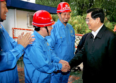 在甲板臨江一側擺放的武漢天興洲公鐵兩用長江大橋模型前,胡錦濤駐足仔細觀看。劉志軍介紹說:“這座斜拉大橋的正橋全長4657米。它有四個世界第一:一是跨度第一,主跨達504米;二是寬度第一,底部寬30米,上部公路橋寬27米,橋上建了四條鐵路線,其中兩條是快速的客運專線,兩條是重載的貨運線;三是載荷第一,它的承重量是兩萬噸;四是速度第一,開通后,火車速度目標值可達每小時200公里以上。這座橋是當今世界第一流的最現(xiàn)代化的大橋,建成后我國建橋的歷史將翻開新的一頁!焙\濤親切地與大橋工程技術人員攀談起來,詢問他們大橋主跨在哪里、橋基的深度是多少、設計和施工采用了哪些新技術等問題。大橋局集團負責同志還向總書記匯報說,中鐵大橋局集團20世紀80年代以來,平均每月建造一座橋,許多紀錄被載入世界建橋史冊。總書記欣慰地勉勵大家再接再厲,高質量地完成天興洲大橋建設任務。