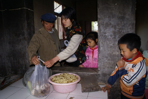 圖為:早晨,丁潔將學(xué)生帶的土豆、玉米面、蒜頭等送到“愛心食堂”(由社會愛心人士捐建的),交給食堂師傅給孩子們做中餐